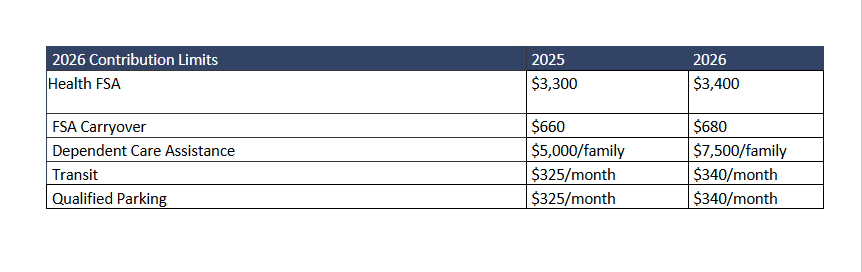 On October 9th, the IRS released the 2026 maximum contribution limits for Flexible Spending Arrangements (FSA) and commuter accounts. Rev. Proc. 2025-32 provides the inflation-adjusted items for 2026 for various code provisions.